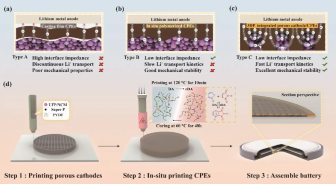 图1. 具有不同电极/CPE界面结构的SSLMBs示意图:a)通过浇铸成膜法制备的CPE;b)原位聚合形成的CPE;c)原位3D打印多孔正极/CPE一体化结构。d)基于热可逆DA键的原位3D打印多孔正极/CPE一体化结构的制备流程示意图。